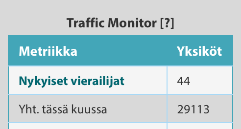 Traffic Monitor näyttää kuinka monta "osumaa" Snoobi kerää verkkosivustoltasi ja kuinka paljon niistä on "botteja". Lue lisää bottiliikenteestä tästä artikkelista: (https://www.snoobi-technology.com/fi/bottraffic-and-snoobi-analytics/)