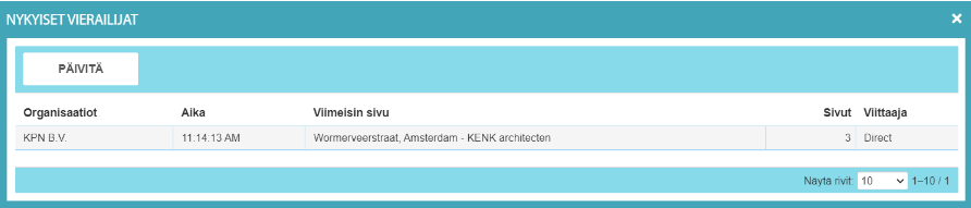 Jos klikkaat taulukossa "Nykyiset vierailijat" -tekstiä, saat esiin ikkunan, jossa on yksityiskohtainen näkymä reaaliaikaisista vierailijoista: