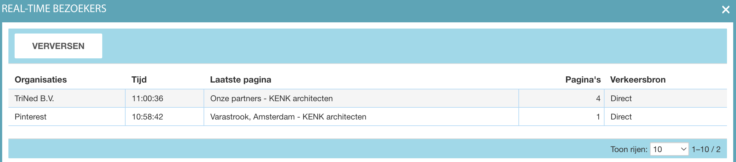 Als u op de tekst 'Real-time bezoekers' in de tabel klikt, wordt een venster geopend met een gedetailleerd overzicht van de bezoekers op dat moment: