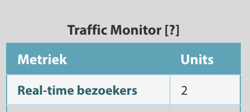 Real-time analytics zet gegevens om in inzichten onmiddellijk nadat ze van uw website zijn verzameld. Op het hoofdscherm van Snoobi is het zichtbaar als een metriek in de Traffic Monitor: