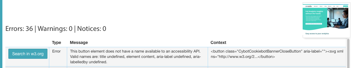 ☞ Huomio: jos verkkosivustosi sivuilla käytetään evästebanneria, se voi aiheuttaa virheitä tai varoituksia, joihin et voi vaikuttaa. Emme voi estää tätä, mutta voit tarkistaa ne sarakkeesta 'Konteksti'.